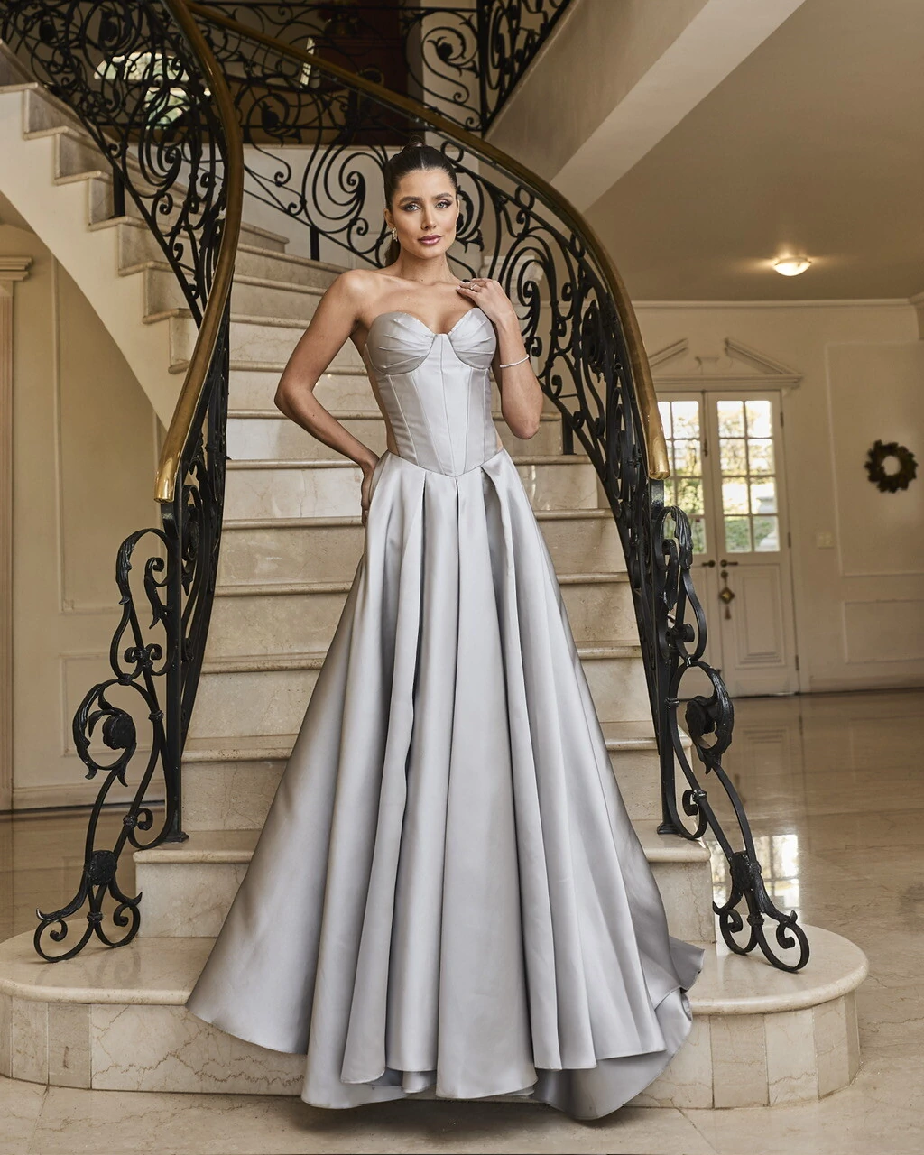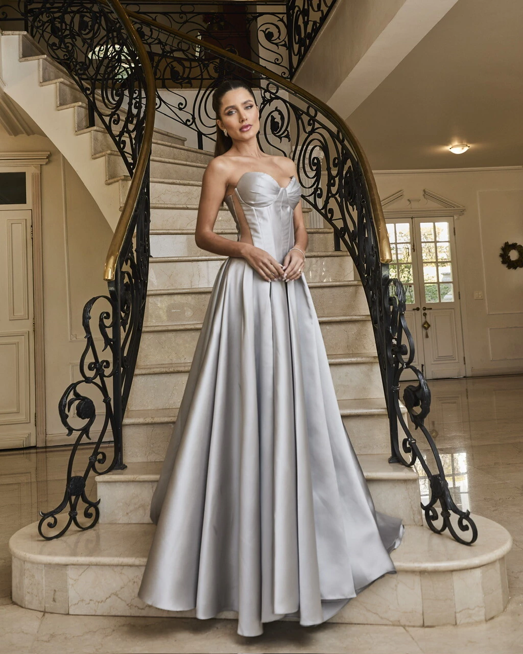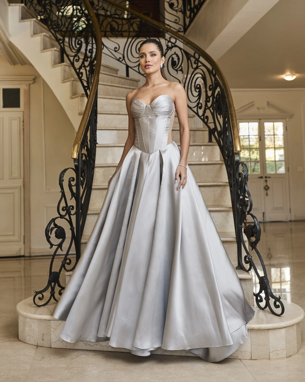 A silhueta é cuidadosamente modelada por um corset de cintura baixa, que realça a forma feminina com precisão e elegância.