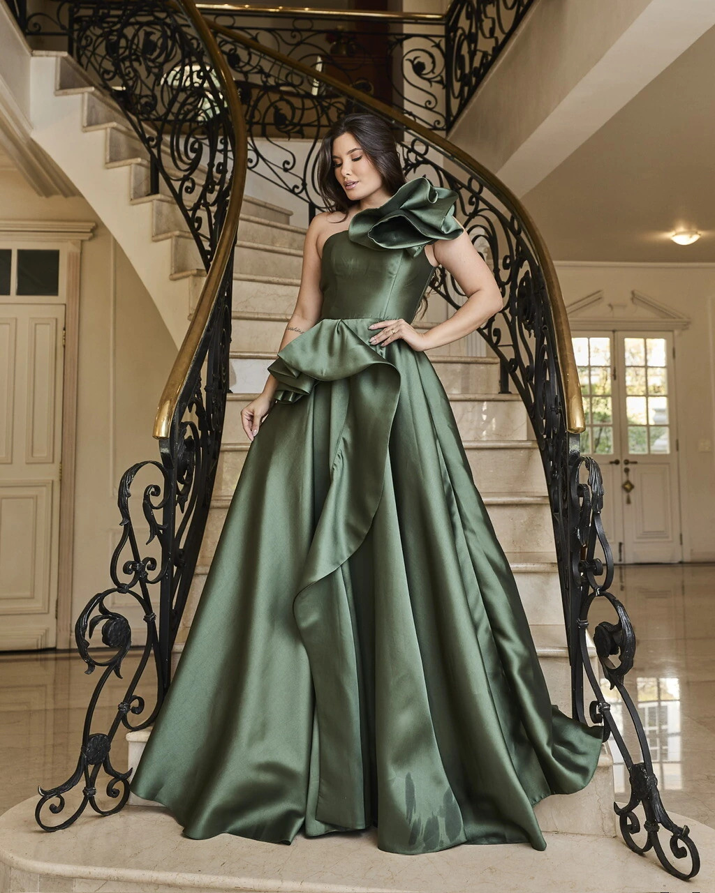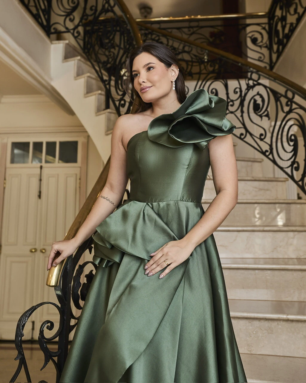O ombro único com máxi detalhe transforma a peça em um verdadeiro statement de elegância, enquanto a saia levemente ampla se move com suavidade, criando um efeito que parece suspirar a cada passo.