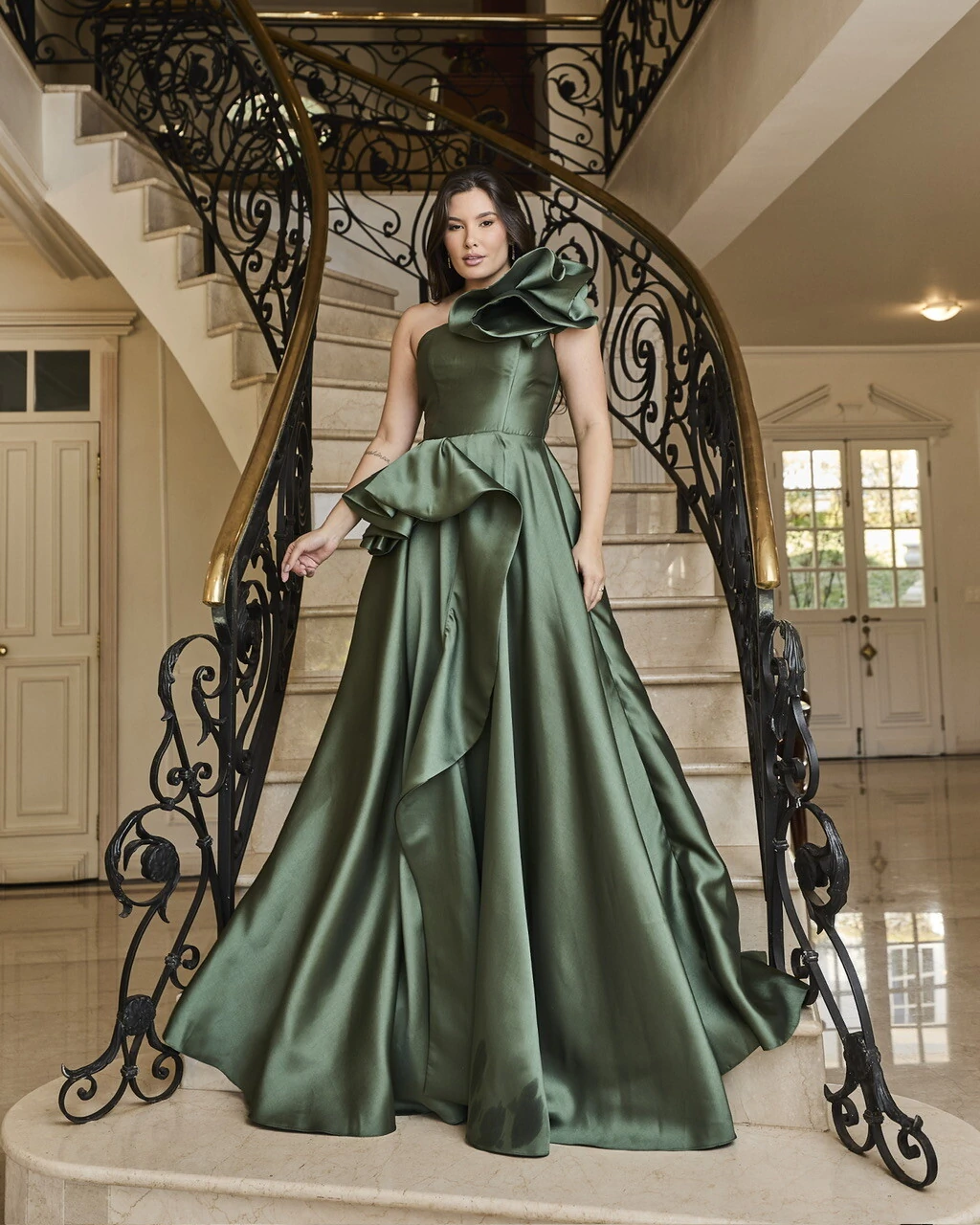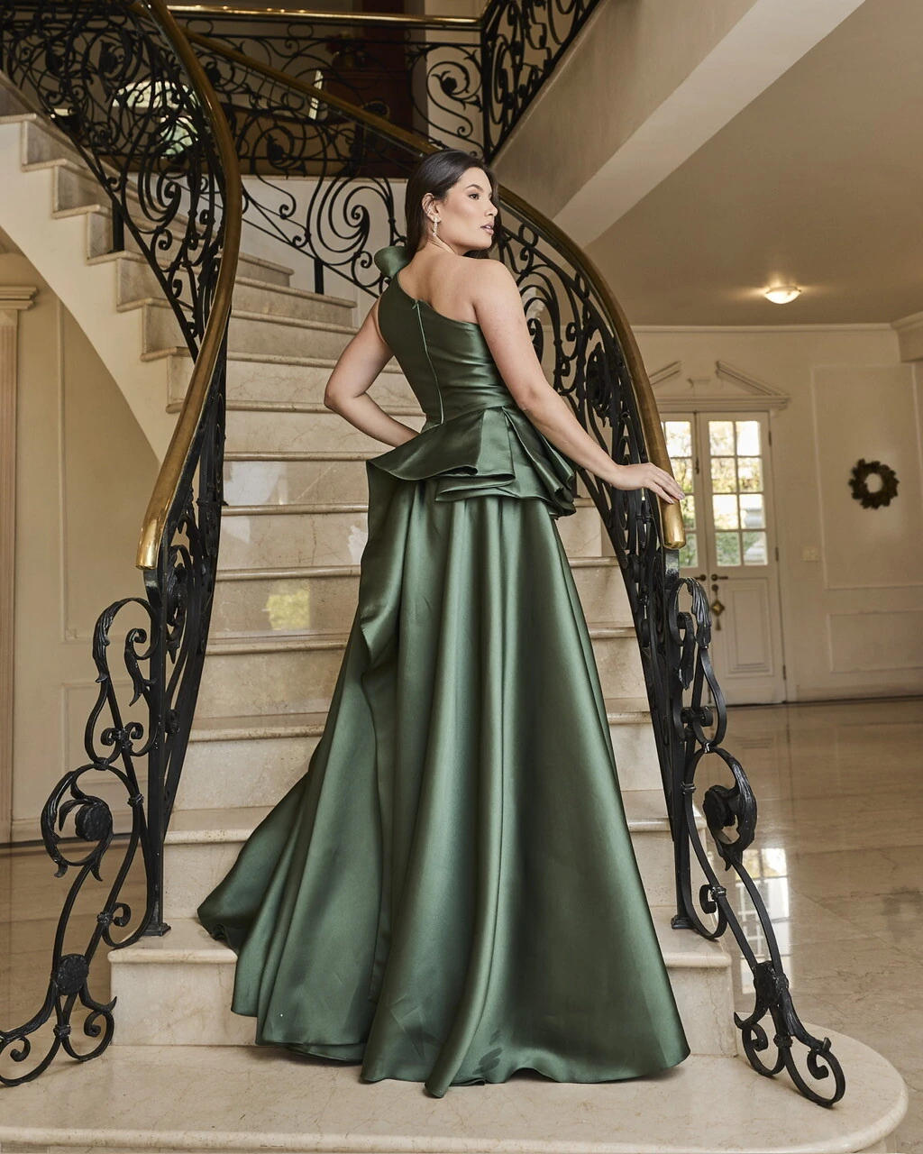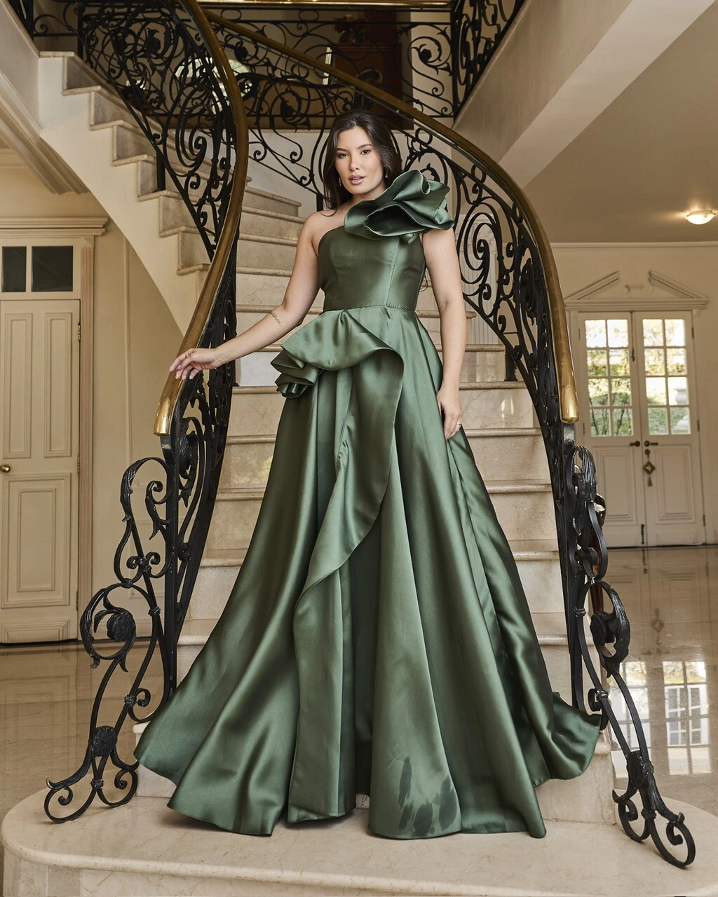 O ombro único com máxi detalhe transforma a peça em um verdadeiro statement de elegância, enquanto a saia levemente ampla se move com suavidade, criando um efeito que parece suspirar a cada passo.