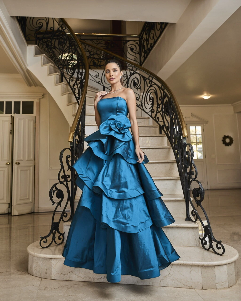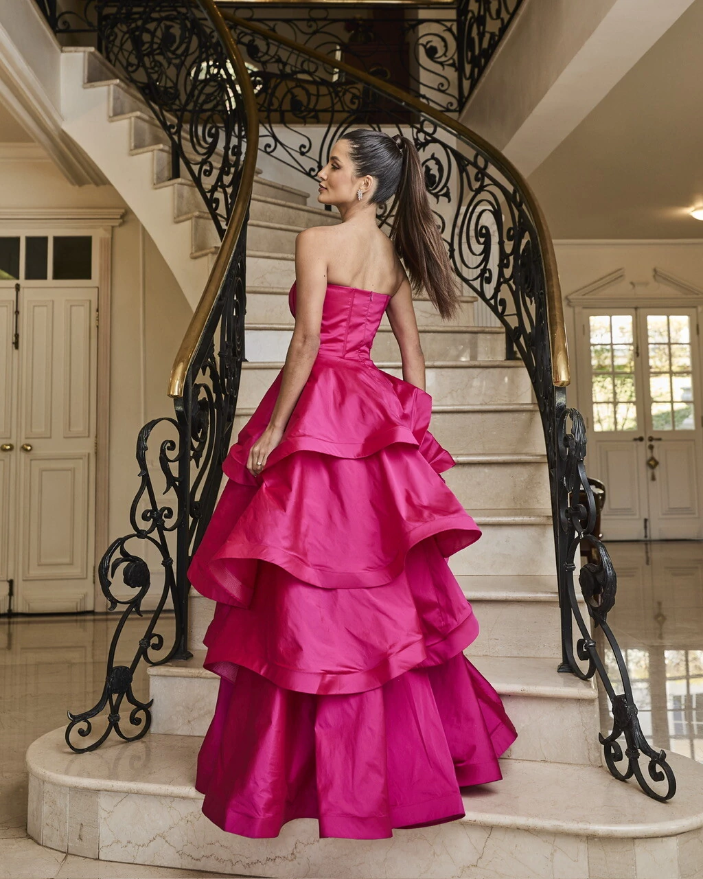 A estrutura precisa da alfaiataria valoriza cada curva com imponência, enquanto a saia em camadas esculpidas confere movimento e volume na medida certa.